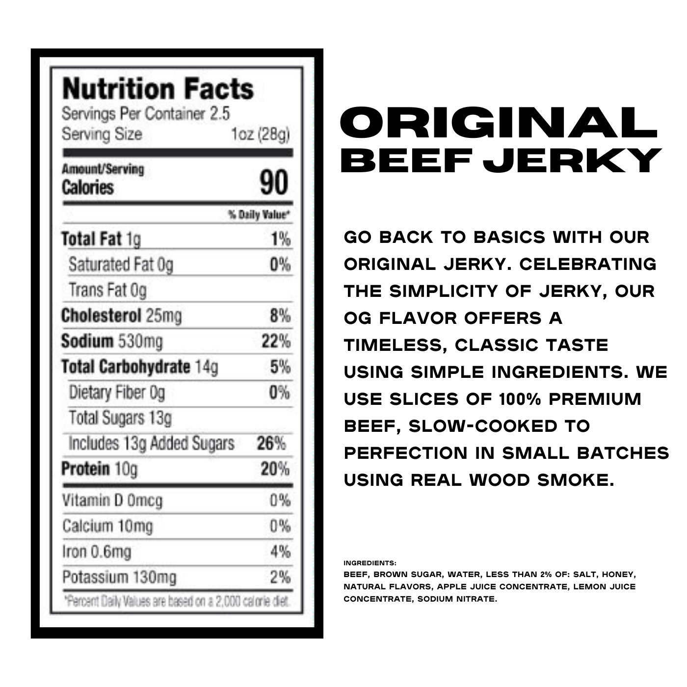 Go back to basics with our Original Jerky. Celebrating the simplicity of jerky, our OG flavor offers a timeless, classic taste using simple ingredients. We use slices of 100% premium beef, slow-cooked to perfection in small batches using real wood smoke. Ready to be enjoyed anytime, anywhere.